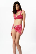 Göz alıcı İtalyan saten kumaştan üretilmiştir. Yanları büzgülü, ön ve arka kısmı drapeli tasarımıyla zarif bir görünüm sunar. Tüm bikini takımları ile uyumlu olacak şekilde tasarlanmıştır.